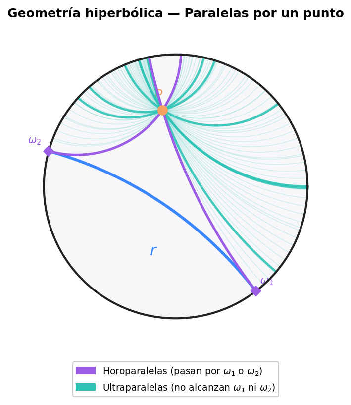 Para visualizarla se usa el disco de Poincaré (Ivorra, 2024, p. 439): el plano hiperbólico completo cabe en el interior de un disco. Los puntos son los del interior; el borde del disco es inalcanzable (representa el "infinito"). Las rectas hiperbólicas son los diámetros del disco y los arcos que cruzan el borde en ángulo recto. Las paralelas por un punto PP a una recta rr son todos los arcos que pasan por PP y no llegan a tocar rr: hay infinitas. En particular, existen exactamente 2 horoparalelas (las geodésicas que pasan justo por los puntos ideales ω1\omega_1 y ω2\omega_2 donde rr toca el borde del disco) e infinitas ultraparalelas (las que van a puntos del borde estrictamente entre ω1\omega_1 y ω2\omega_2).