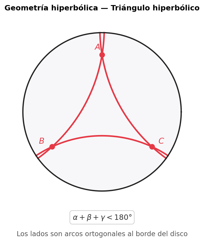 La consecuencia más visible es que la suma de los ángulos de cualquier triángulo es menor que 180°180°. Cuanto más grande es el triángulo, más se aleja la suma de 180°180°. Esto lleva al teorema más sorprendente de esta geometría: dos triángulos con los mismos tres ángulos son necesariamente del mismo tamaño (Ivorra, 2024, p. 433). En la geometría euclídea podemos tener triángulos semejantes (mismos ángulos, distinto tamaño); en la hiperbólica eso es imposible. Los ángulos determinan completamente la figura.